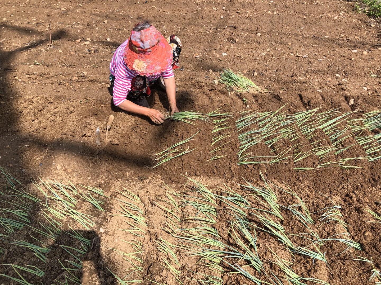그 옆에 있는 밭에서는 김화자님이 파를 뽑아서 옮겨 심고 있었는데, 요즘 뭐 하시는가 여쭤 보니 ‘콩은 심었고 이른 들깨부터 해서 들깨도 한창 심을 때’라고 하시는데, 파를 심는 손놀림을 잠시도 멈추지 않고 줄줄 말씀을 하신다는 점이 놀라웠지요.