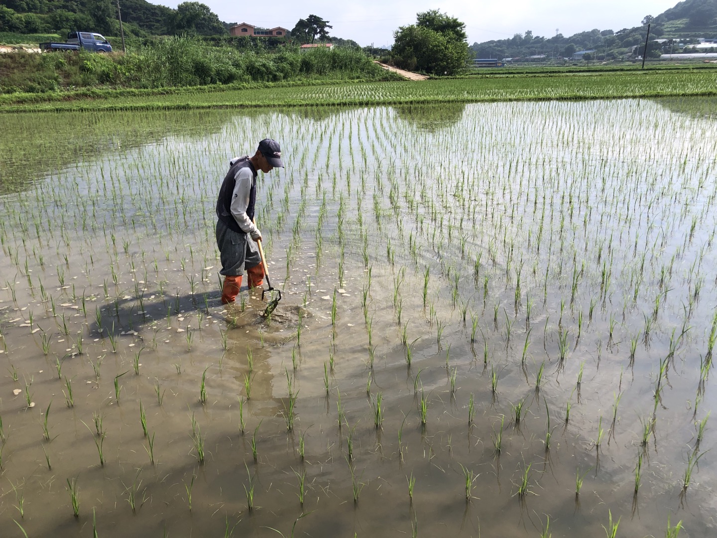 논에 잔뜩 부어넣은 우렁이들이 풀을 골고루 먹어주지 않아서, 풀이 모 사이로 삐죽삐죽 나오고 있습니다. 금창영 님은 딸깍이를 들고 며칠 째 논 바닥을 긁는 중이랍니다.