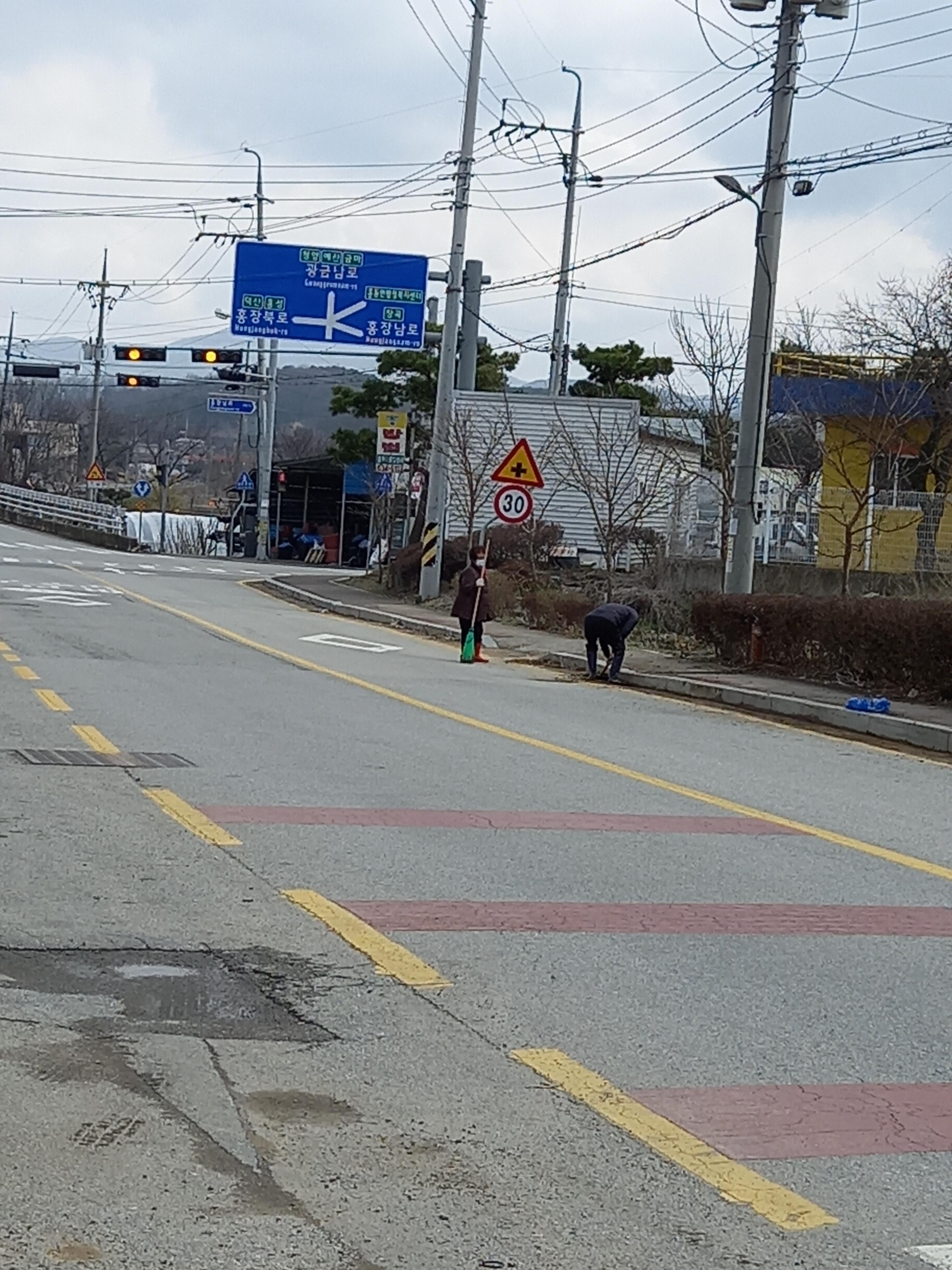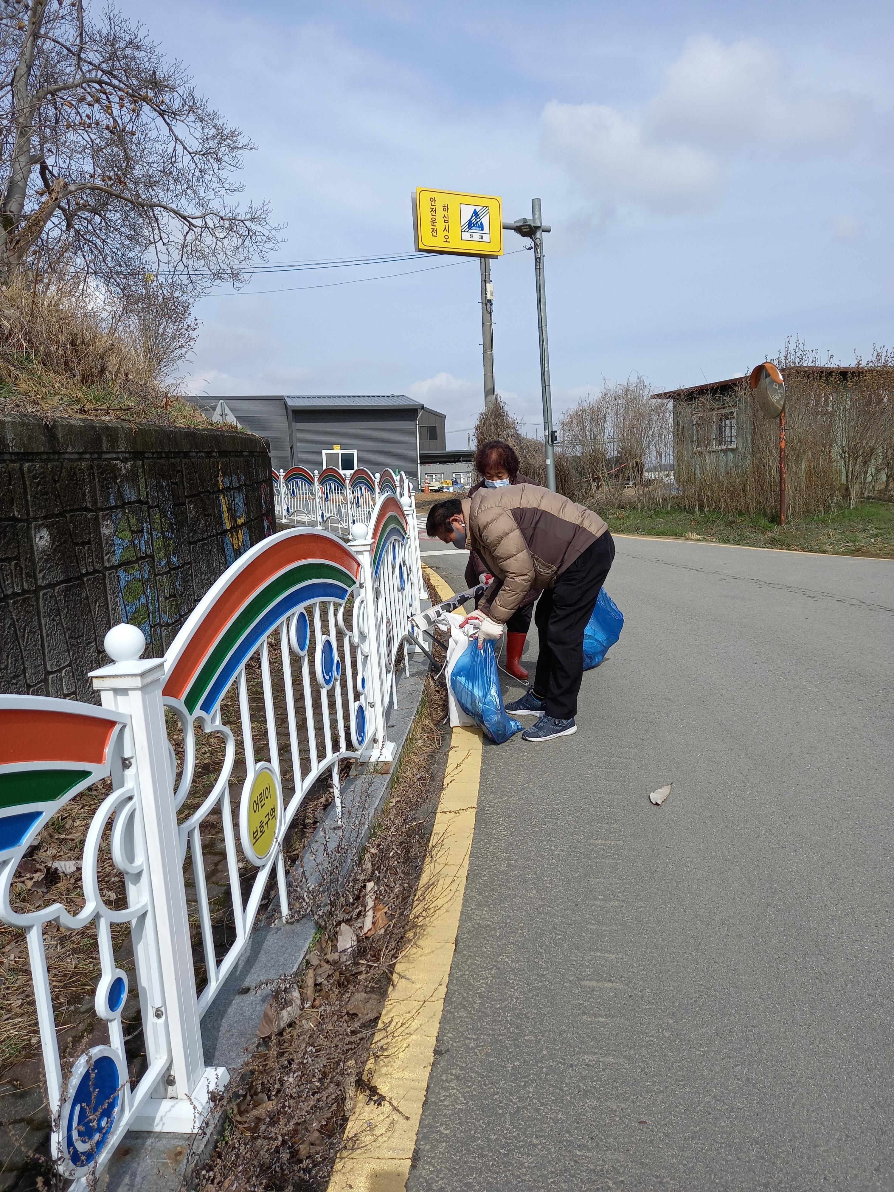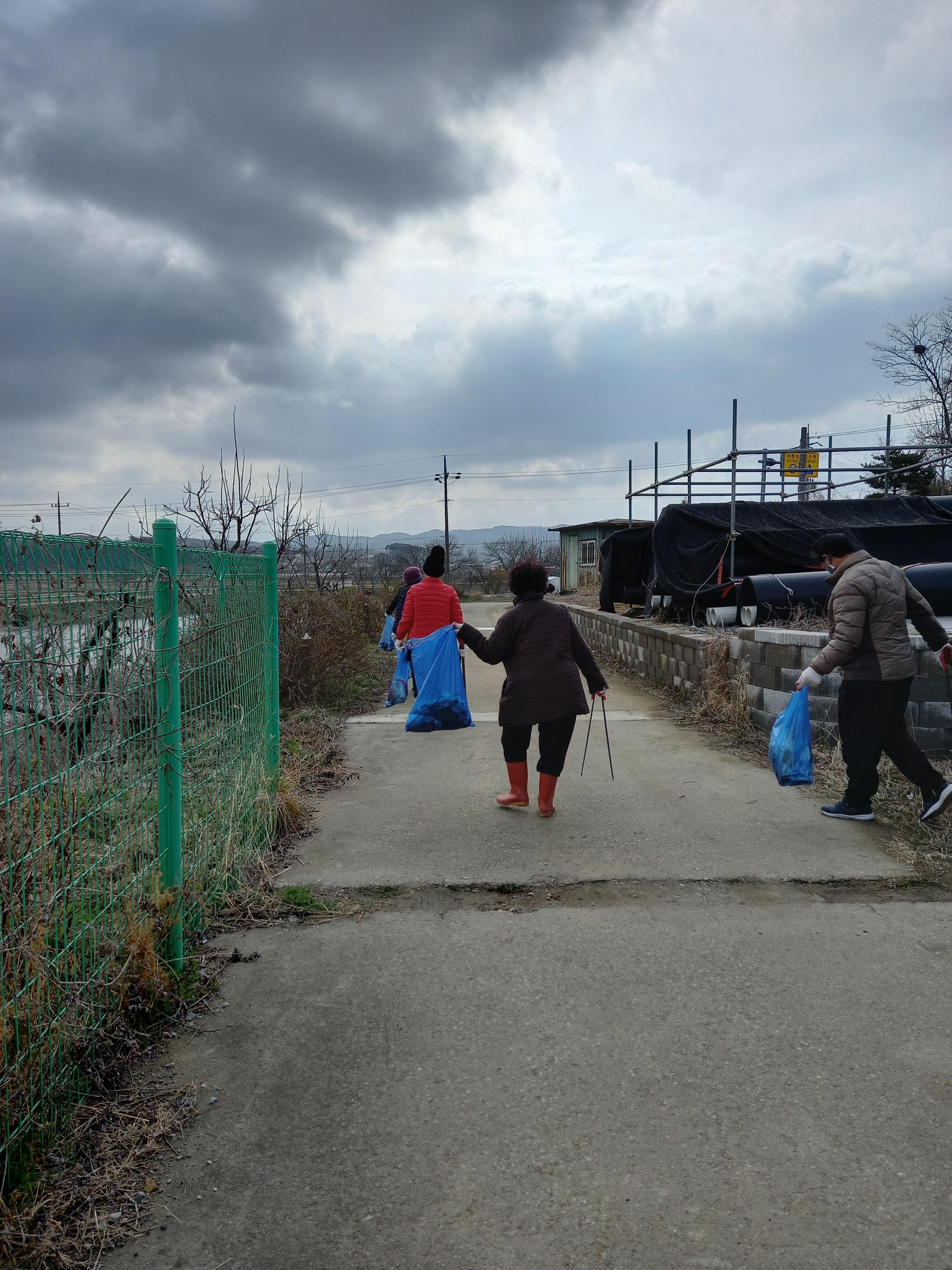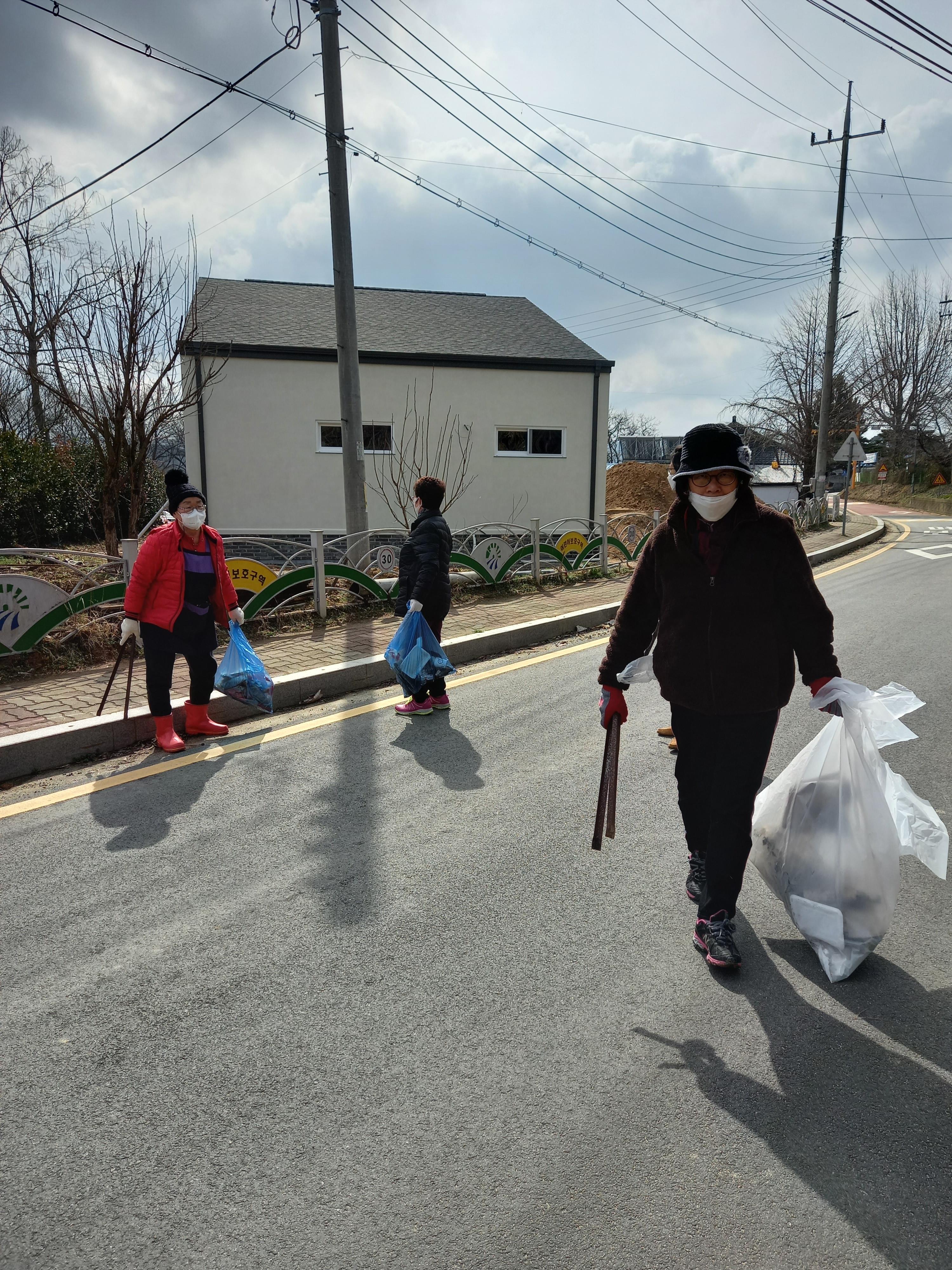 어느새 수선화 꽃대가 올라오는걸 눈치챘는지, 꽃샘추위가 봄비와 함께 안간힘을 쓰던 그즈음, 우리 마을 주민들은 추위에 아랑곳하지 않고 예정되었던 대로 마을 안길 곳곳의 담배꽁초와 마스크 등등 쓰레기를 줍기 시작했습니다. 또 겨우내 켜켜이 쌓인 도로가의 흙먼지를 삽으로 퍼내고 쓸어내고, 마을옆 하천 둑에 희끗희끗 버려져있는 쓰레기들을 줍고, 우리 마을에서 하천변에 식재한 이팝나무 전지도 깔끔하게 마쳤습니다.